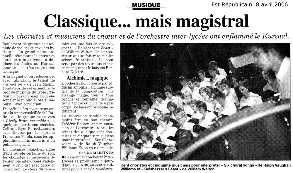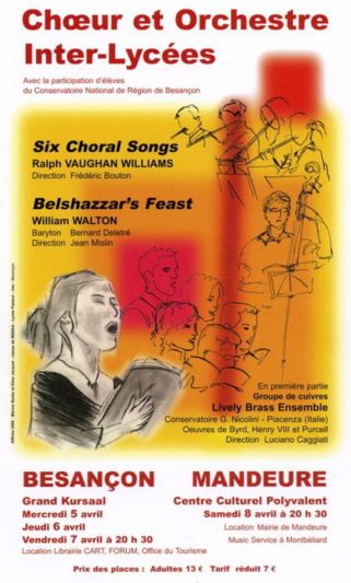 Belshazzar’s Feast est un oratorio sur un texte de Osbert SITWELL et mis en musique par William WALTON pour baryton, chœur et orchestre. D’une grande puissance dramatique, cette œuvre relate un épisode biblique du Livre de Daniel (5, 1-30) : le festin de Balthazar. Le peuple d’Israël est en captivité à Babylone. Au cours d’un festin le roi de Babylone, profane la vaisselle sacrée dérobée à Jérusalem par Nabuchodonosor. Une main apparaît alors et écrit des mots incompréhensibles contre le mur. La nuit même Balthazar est assassiné. Israël se réjouit de la chute de Babylone. Walton y déploie un langage d’une rare luxuriance sollicitant tous les interprètes à un très haut niveau. La richesse harmonique le dispute à l’entrain rythmique qui caractérise maint passage. Œuvre jubilatoire, gageure pour un groupe comme l’Inter-Lycées dont la fougue juvénile sera constamment sollicitée, cet oratorio d’une grande intensité sera donné pour la première fois à Besançon.